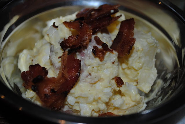 Potato salad is great by itself but when you add crunchy bacon on top it taste even better! I try to make it a little healthier by not adding all the yolks from the hard boiled eggs I used for this dish.